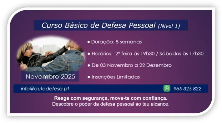 O Curso Básico de Defesa Pessoal foi criado para ensinar o essencial da autoproteção, das táticas físicas e da prevenção da violência. É ideal tanto para quem dá os primeiros passos em defesa pessoal, como para quem já frequentou formações anteriores e quer consolidar e aprofundar as suas competências. Independentemente da idade, género, condição física ou experiência, este curso é pensado para o cidadão comum que pretende aprender a agir com mais confiança e segurança no dia a dia. Ao longo de oito semanas, vamos aprender a reconhecer comportamentos de risco, a manter a calma sob pressão e a agir com segurança e controlo perante situações de ameaça.